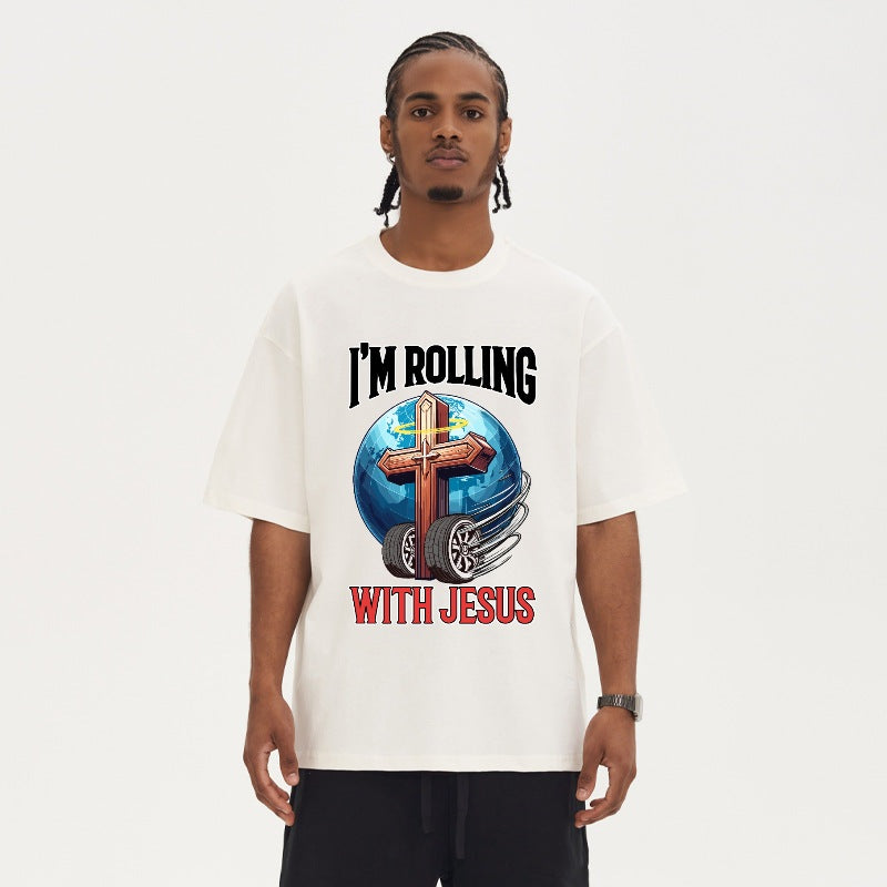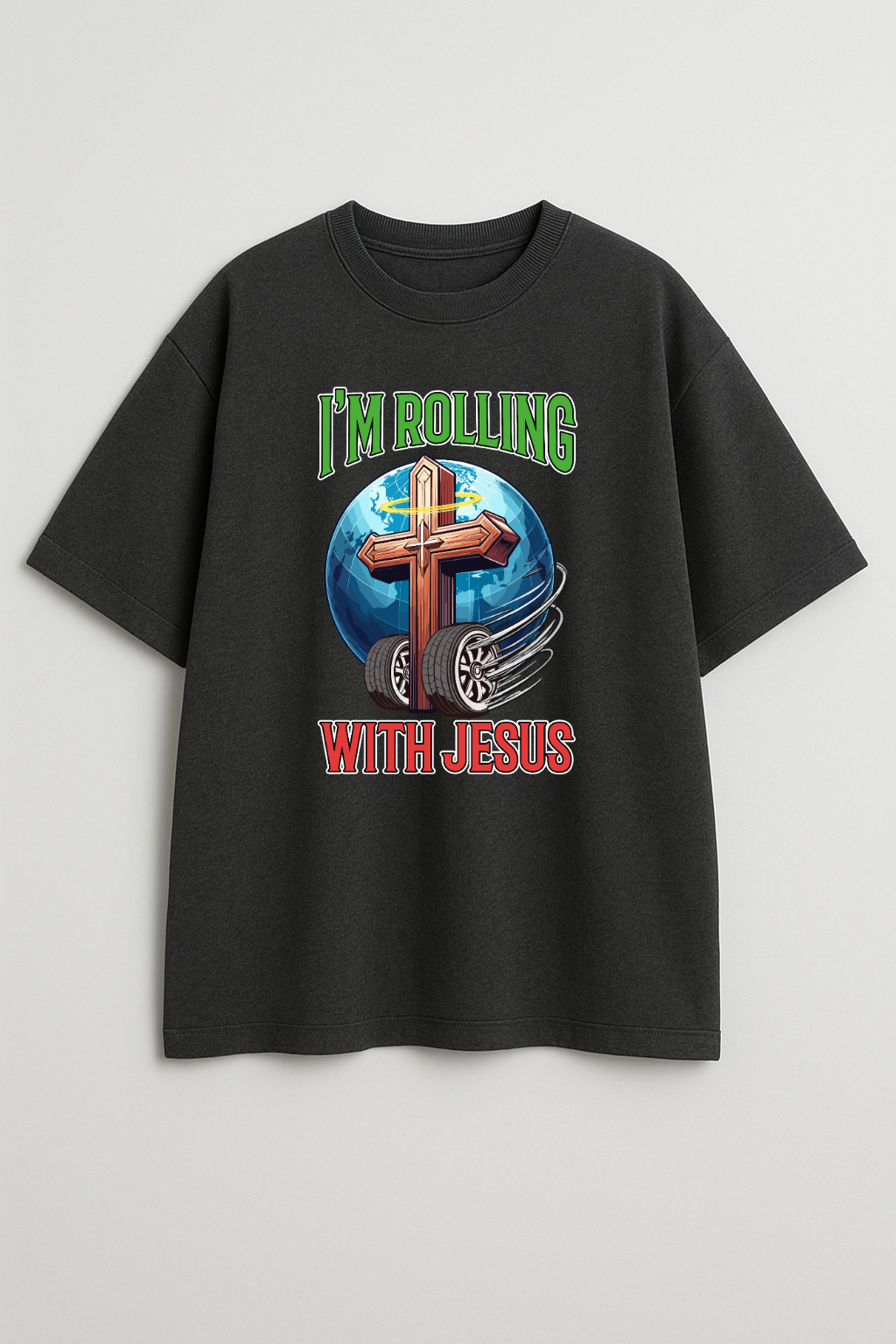 Rolling with Jesus oversized t-shirt - faith meets street style. Heavyweight cotton, bold print, relaxed fit. Part of Boniwear's Trending Now drop. Express your faith with authentic streetwear. Shop now.
